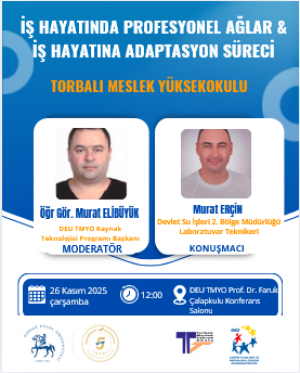 📢İş Hayatında Profesyonel Ağlar & İş Hayatına Adaptasyon Süreci Konulu Konferans Duyurusu Yayınlanma Tarihi: 20-11-2025 Konu: İş Hayatında Profesyonel Ağlar & İş Hayatına Adaptasyon Süreci Tarih: 26 Kasım 2025 Saat:12:00 Yer: DEU TMYO Prof. Dr. Faruk ÇALAPKULU Konferans Salonu